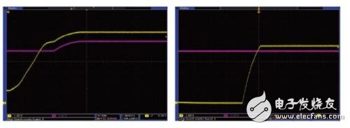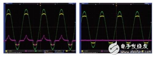 Figure 4: ADC input (yellow), driver input (green), and reference voltage (purple). The right image includes a Schottky diode (BAT54S) to protect against overvoltage, while the left image does not.